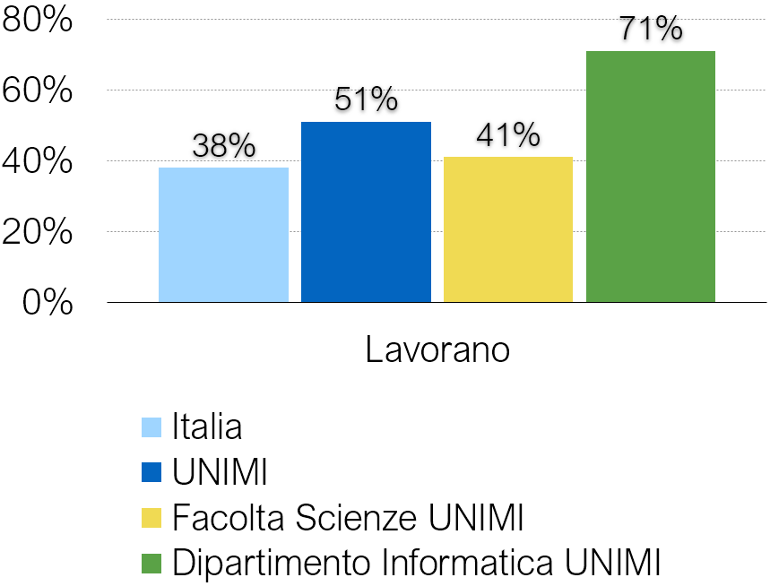 Questo grafico mostra che oltre il 70% degli studenti che hanno conseguito una Laurea Triennale presso il Dipartimento di Informatica riesce a trovare un lavoro. Questo valore è notevolmente più alto della media dei laureati triennali in tutti i Corsi di Laurea in Italia, dei Laureati Triennali di UNIMI e dei Laureati Triennali della Facoltà di Scienze e Tecnologie di UNIMI.