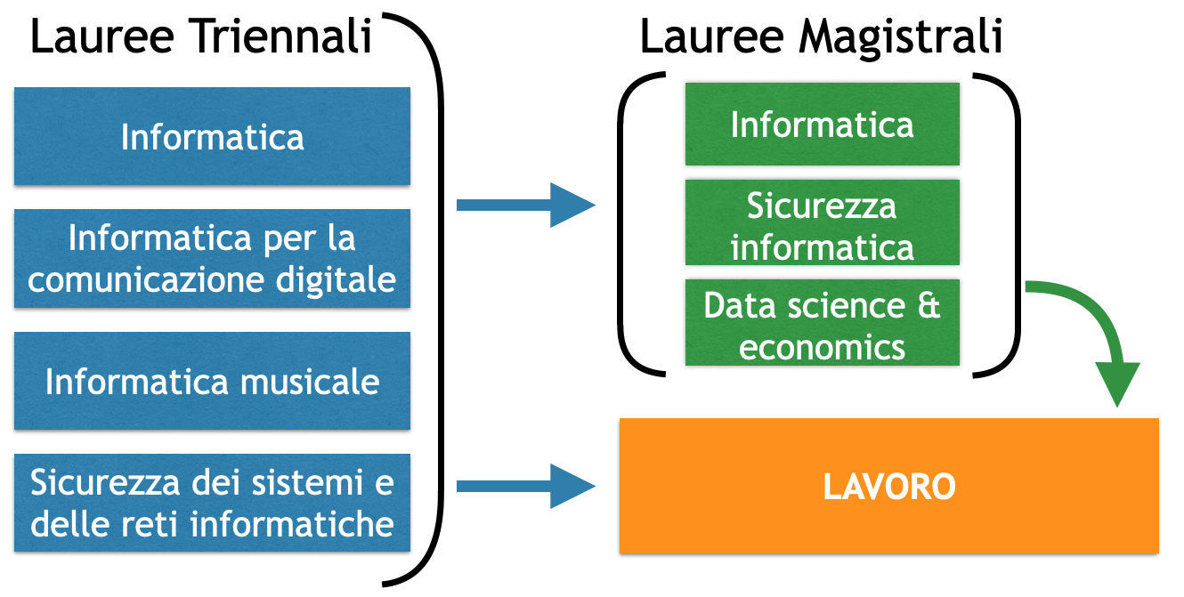 Certo è difficile fare previsioni sulle scelte da compiere tra tre anni: continuerai a studiare oppure cercherai un lavoro? Un grande vantaggio dei Corsi di Laurea Triennali erogati dal Dipartimento di Informatica è che ti preparano per entrambe le alternative: potrai continuare a studiare per conseguire una Laurea Magistrale, oppure collocarti nel mondo del lavoro, forte di competenze molto richieste, grazie alle quali potrai accedere a incarichi qualificati e ben retribuiti.